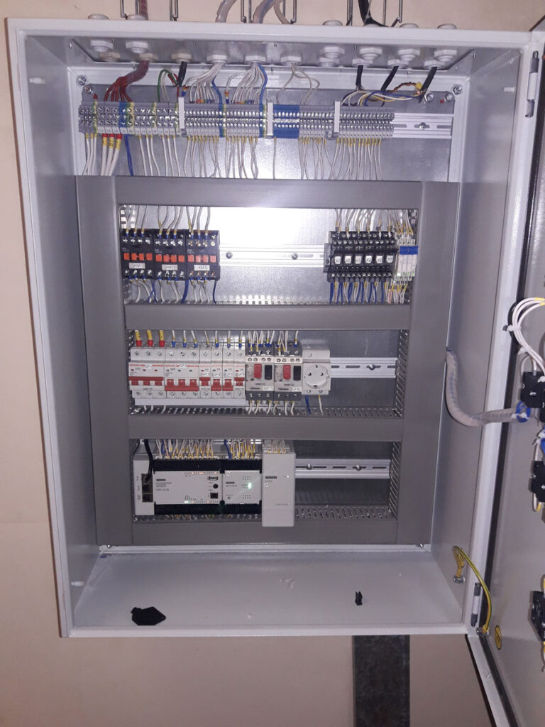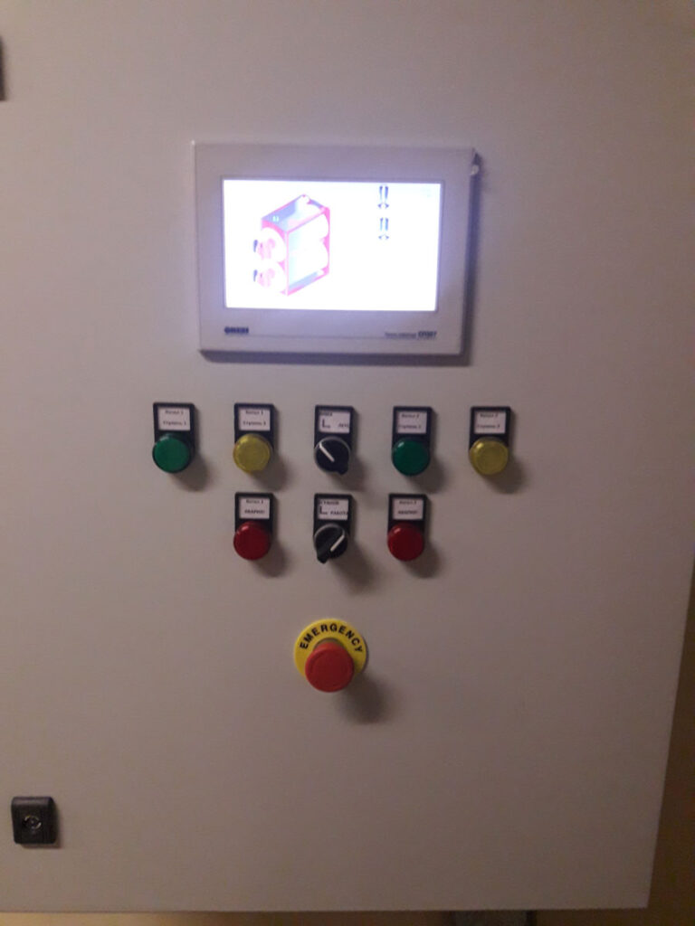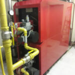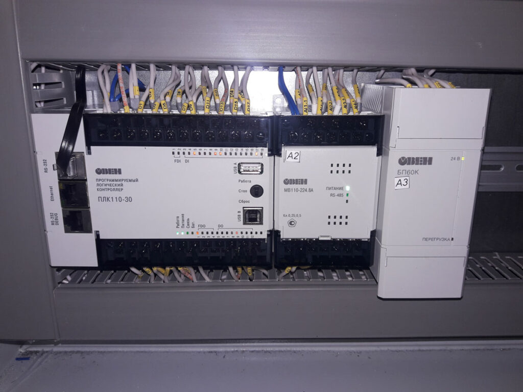 Проведено перевооружение двух газовых котлов серии Duomax 600 — замена действующего шкафа автоматики, оснащение программным обеспечением, настройка автоматики котлов, пусконаладочные работы. В основу системы управления положен программируемый контроллер ОВЕН ПЛК110-30 с модулем ввода аналоговых сигналов ОВЕН МВ110-224.8А и питанием автоматики от блока питания для контроллеров и ответственных применений ОВЕН БП60К. Управление осуществляется с помощью сенсорной панели оператора ОВЕН СП307.