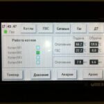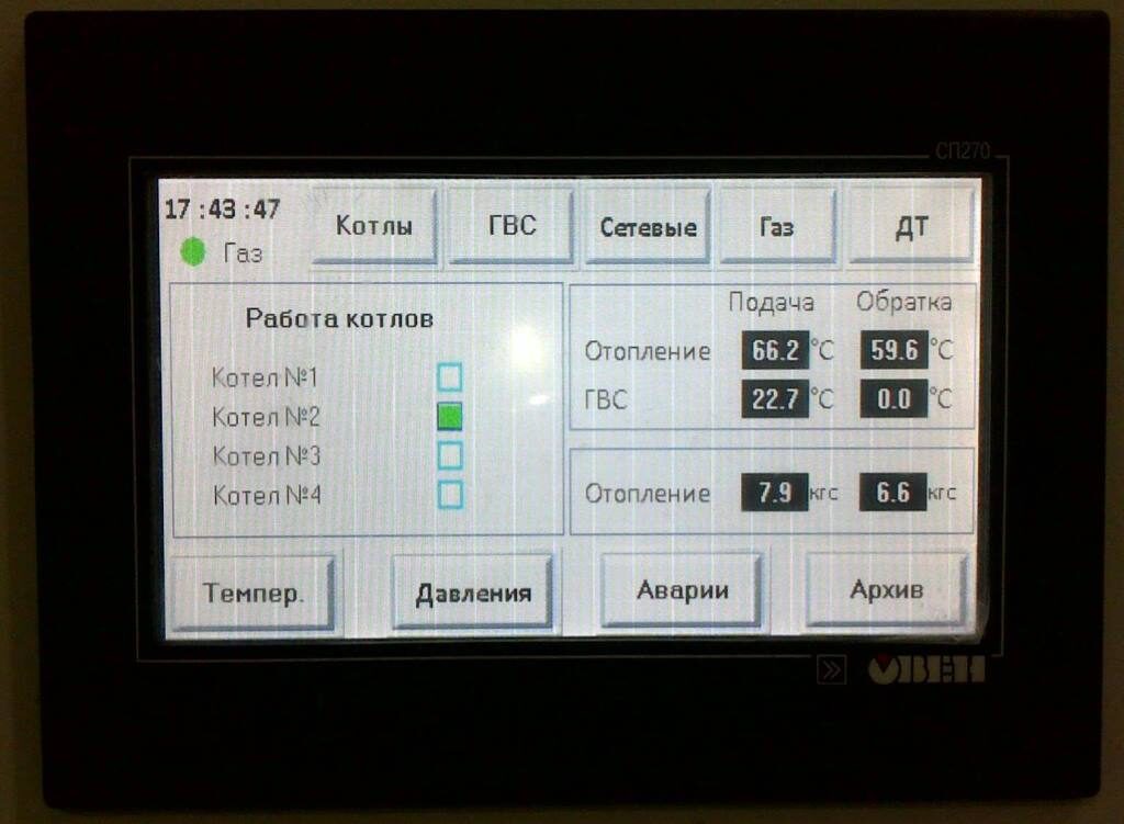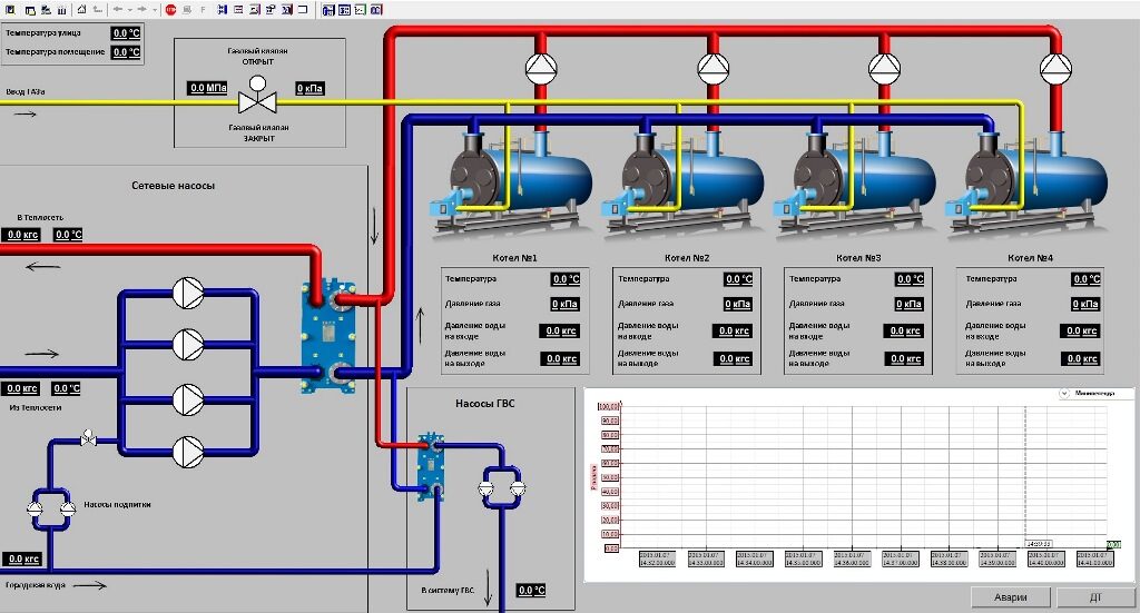 - Система собирает параметры котельной с датчиков и отображает их на 2х устройствах — панель оператора и персональный компьютер. Все аварийные параметры архивируются и доступны для просмотра с указанием времени наступления события и его квитирования. Так же на компьютере доступны архивы всех измеряемых параметров и просмотре их на тренде (с построением необходимых графиков)
