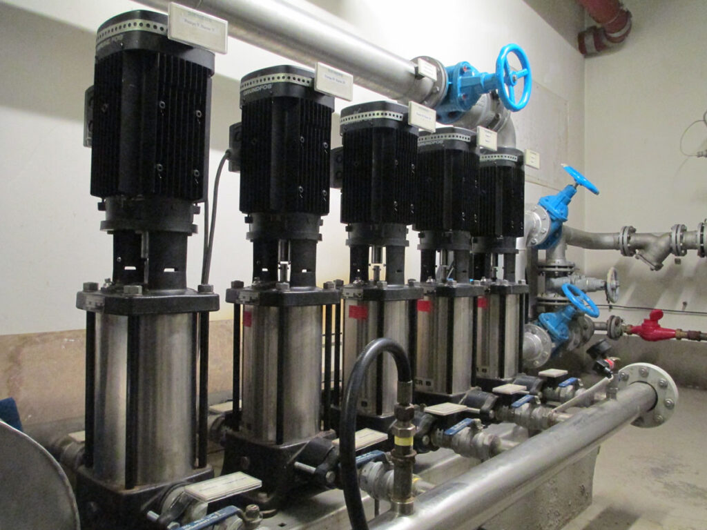 Автоматика системы холодного водоснабжения (ХВС) находилась в нерабочем состоянии, насосы включали вручную, о точности поддержания давления воды в трубопроводах не было и речи. В ходе выполнения работ была заменена автоматика насосной (управляющий контроллер и датчики). Силовую схему управления насосами, состоящую из автоматических выключателей, пускателей и частотного преобразователя оставили без изменений.