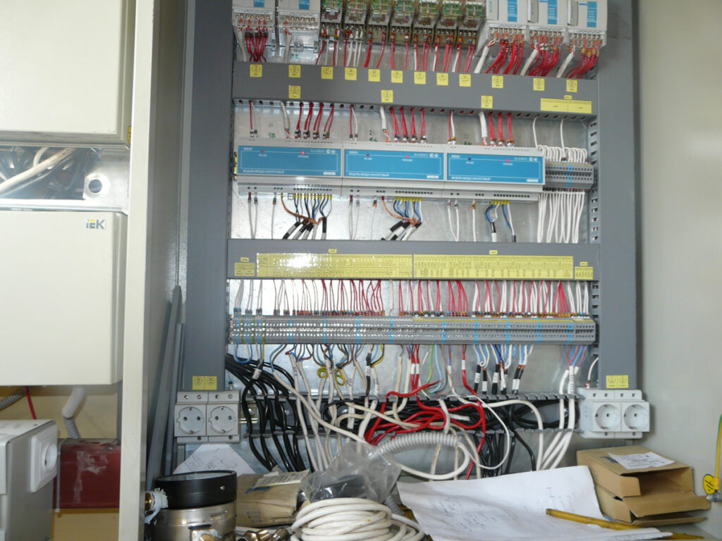 Теоретически были рассмотрены 2 – 3 варианта, в том числе с использованием оборудования различных зарубежных производителей, но стоимость разработки при этом выходила в 2-5 раз больше, чем с использованием оборудования российского производителя – компании ОВЕН. Плюсом к тому явилось и то, что буквально под боком находится дилер компании ОВЕН, благодаря чему приобрести оборудование можно было с минимальными затратами на доставку. Таким образом, наиболее оптимальным вариантом стал выбор программируемого логического контроллера ОВЕН ПЛК100. Для наглядного отображения технологических параметров системы, вывода нештатных ситуаций и введения настроечных параметров и значений аварийных уставок используется панель оператора ОВЕН ИП320. Для сбора информации с датчиков давления и температуры и преобразования сигналов используются модуль ввода аналоговый МВА8 (3 шт.), модуль ввода дискретных сигналов МВ110-16Д (2 шт.) и модуль дискретного вывода МУ110-8Р. Помимо их в системе используются блоки питания ОВЕН БП60Б-Д4 и БП15Б-Д2, а также блок согласования фильтров БСФ. Конструктивно система управления выполнена в виде щита автоматики.