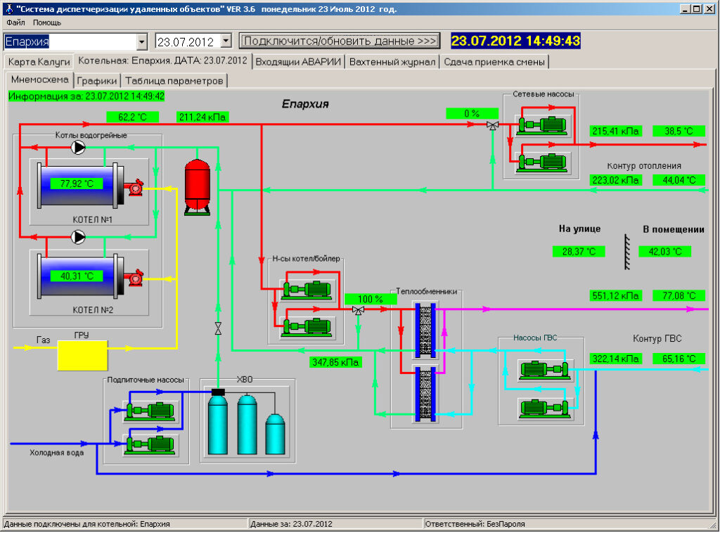 Отображение в режиме реального времени и архивирование технологических параметров котельной, а также нештатных ситуаций осуществляется как в диспетчерской АДС МУП «Калугатеплосеть», так и на сервере диспетчеризации (ул. Складская, 2а).