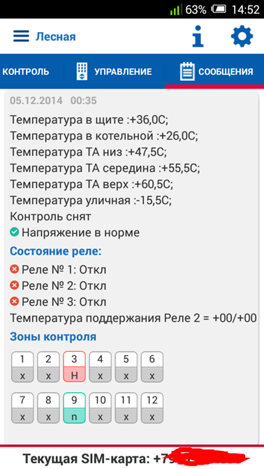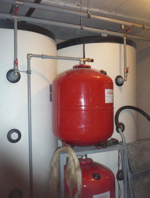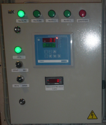 В здании смонтированы две системы отопления, радиаторная и водяные тёплые полы. В котельной установлены два электрокотла и теплоаккумуляторы (далее ТА). В ночном (льготном) режиме тарифа на электроснабжение, котлы работают на отопление здания и запас тепловой энергии в ТА. В дневном режиме, котлы остановлены, разбор тепла происходит от ТА. С точки зрения ТЭО, ёмкости ТА были расчитаны на усреднённый режим покрытия теплопотерь здания. При сильных морозах когда запаса тепла в ТА не хватает на весь день, то в зависимости от температуры и времени в работу подключается одна ступень электрокотла, которая доводит текущую температуры подачи с ТА до заданной по графику.