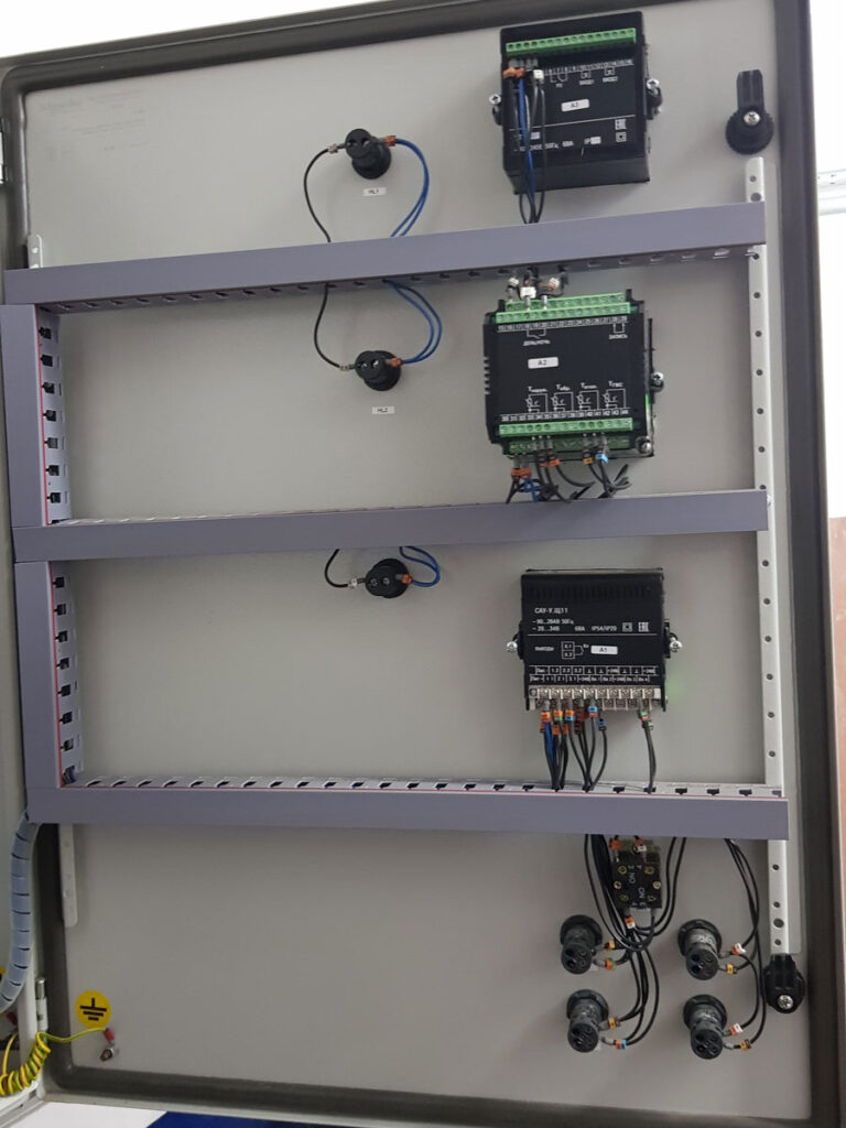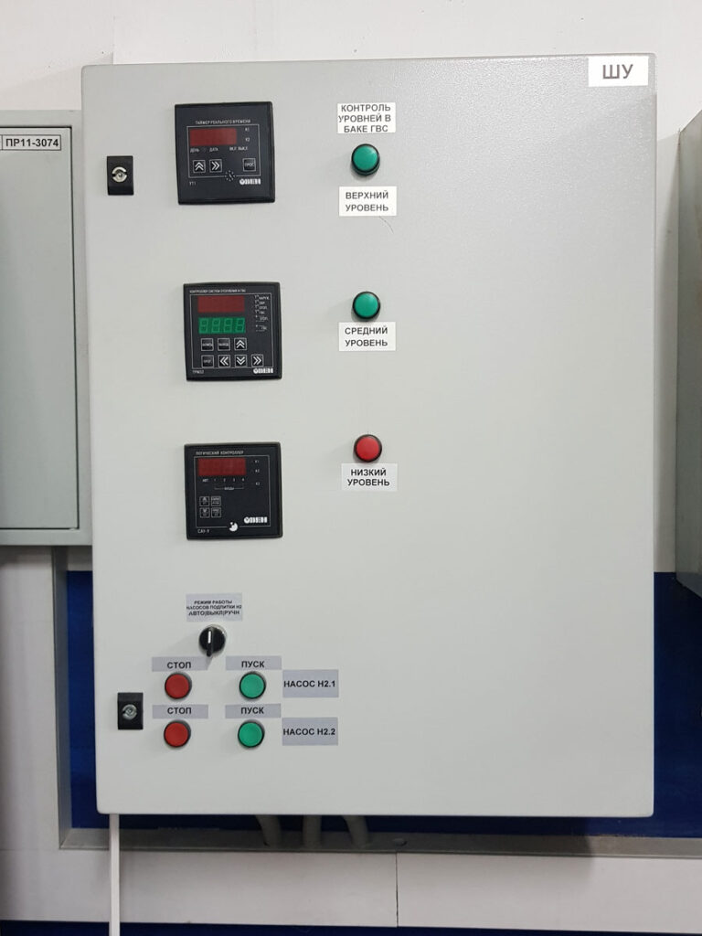 Шкаф ШУ собран на базе двух контроллеров ОВЕН ТРМ212 и ОВЕН САУ-У. Контроллер ТРМ212 предназначен для поддержания необходимой температуры теплоносителя, поступающего в систему отопления, в зависимости от наружного воздуха в соответствии с температурным графиком. САУ-У выполняет функцию резервирования и равномерной выработки ресурса насосов подпитки (переключение рабочего и резервного через каждые 24 часа работы). Функция защиты насосов подпитки от сухого хода осуществляется датчиком давления. Пуск насосов осуществляется по сигналу от датчика давления, установленного на обратном трубопроводе системы отопления. Управление насосами осуществляется также в ручном режиме – от кнопки на двери шкафа ШУ. Контроль уровней теплоносителя в баке-аккумуляторе ГВС предусматривается датчиком уровня кондуктометрического типа.