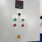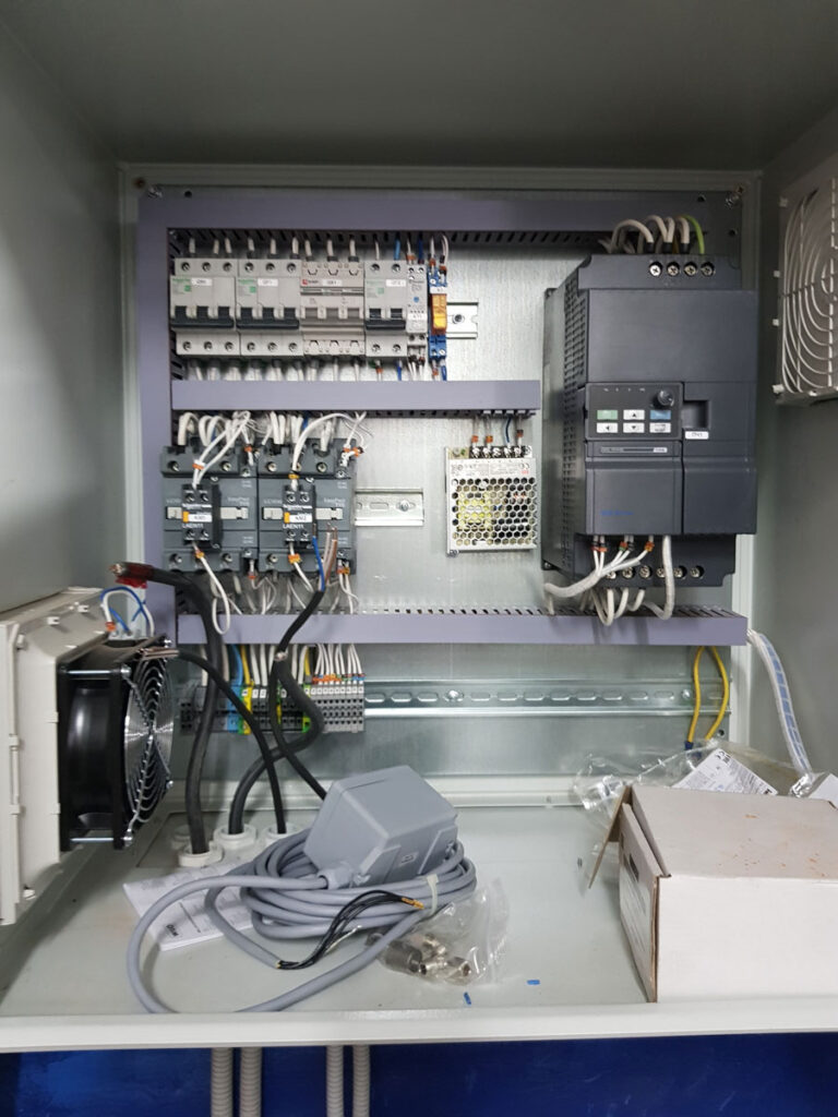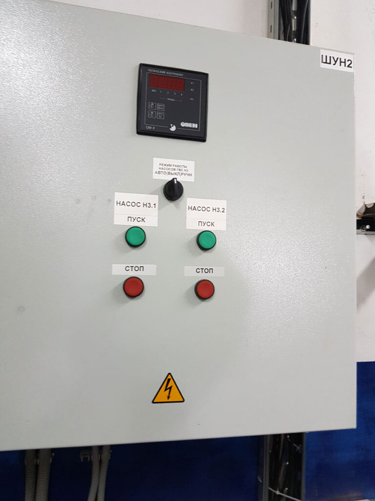 Шкаф ШУН2 предназначен для управления насосами ГВС и собран на базе САУ-У, выполняющего функцию резервирования и равномерной выработки ресурса насосов (переключение каждые 24 час). Для поддержания необходимого давления в системе ГВС в шкафу установлен частотный преобразователь. Измерение давления осуществляется преобразователем давления ОВЕН ПД100И с унифицированным выходным сигналом 4…20 мА. Предусмотрено управление насосами в ручном кнопками режиме с двери шкафа ШУН2.