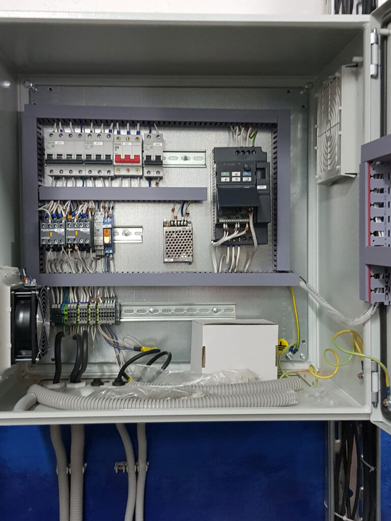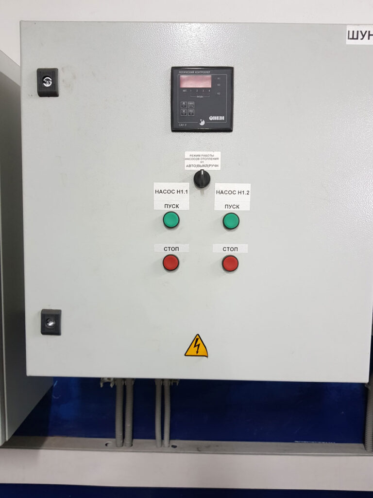 Шкаф ШУН1 предназначен для управления насосами отопления и собран на базе контроллера САУ-У, выполняющего функцию резервирования и равномерной выработки ресурса насосов (переключение основного и резервного каждые 24 час). Для поддержания необходимого перепада давления в системе отопления в шкафу установлен частотный преобразователь. Защита от сухого хода осуществляется датчиком давления. Предусмотрено управление насосами в ручном режиме кнопками с двери шкафа ШУН1.