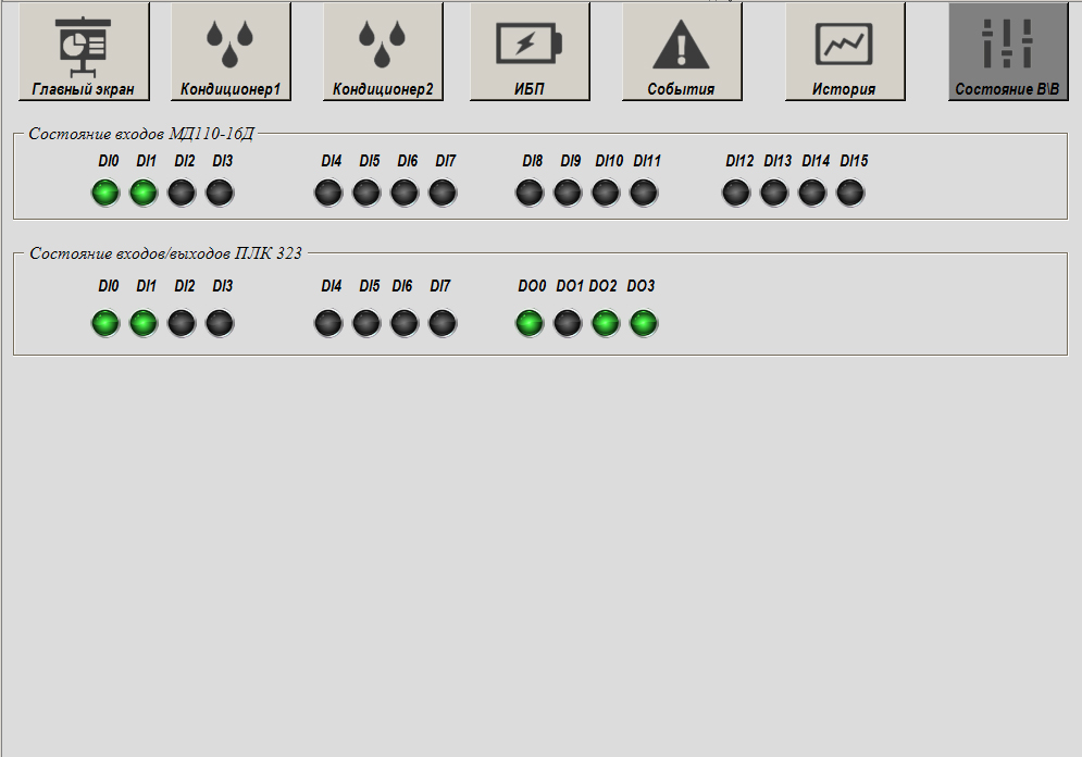 Экран модулей ввода вывода предназначен для тестирования и проверки передачи данных от контроллера к устройствам и обратно.