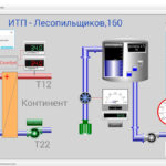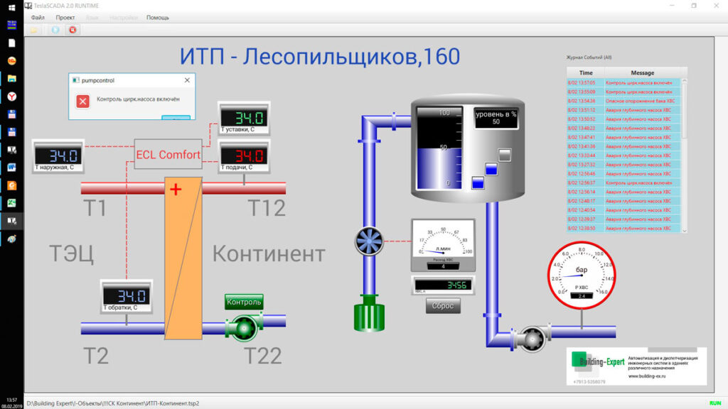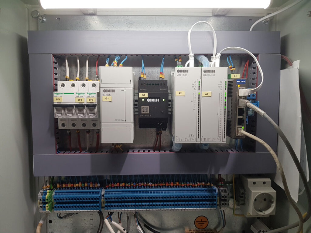 Автоматическое управление системой осуществляет контроллер стороннего производителя. Модули ввода/вывода с Ethernet ОВЕН МВ210-101 (8 AI) и ОВЕН МВ210-202 (20 DI) используются для сбора сигналов с датчиков и передачи их в SCADA-систему. Подключение к контроллеру осуществляется через разъём RJ45, и всё это подключено через коммутатор Moxa в сеть СКС. На компьютере у главного энергетика установлена SCADA-система TeslaSCADA, которая забирает данные по протоколу Modbus TCP. На графическом экране компьютера реализована интуитивно понятная графика технологического процесса с журналом событий и журналом потребления холодной воды.