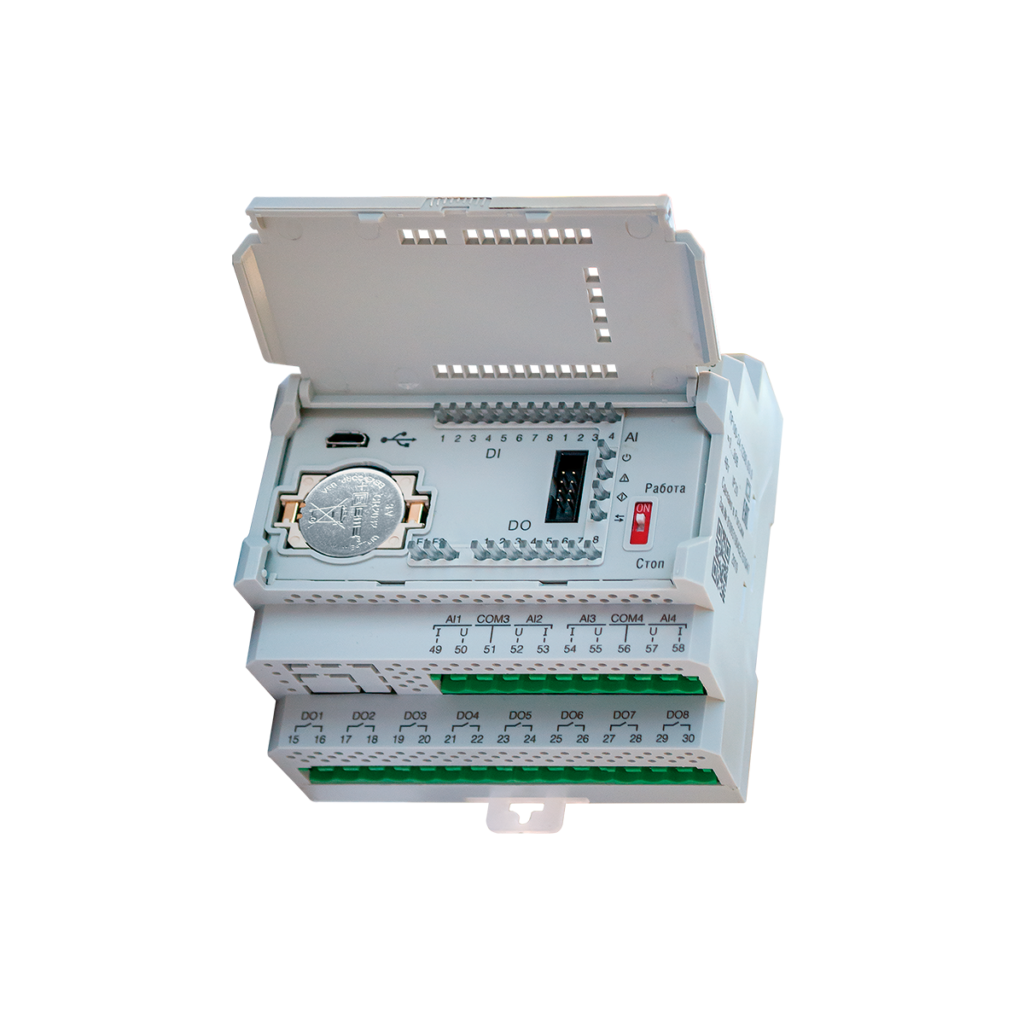 Прибор изготавливается в автоматном корпусе 5 DIN. Имеет на борту аналоговые и дискретные входы, а также дискретные выходы. Для управления устройствами по сети или передачи данных на верхний уровень в приборе предусмотрен интерфейс RS-485.