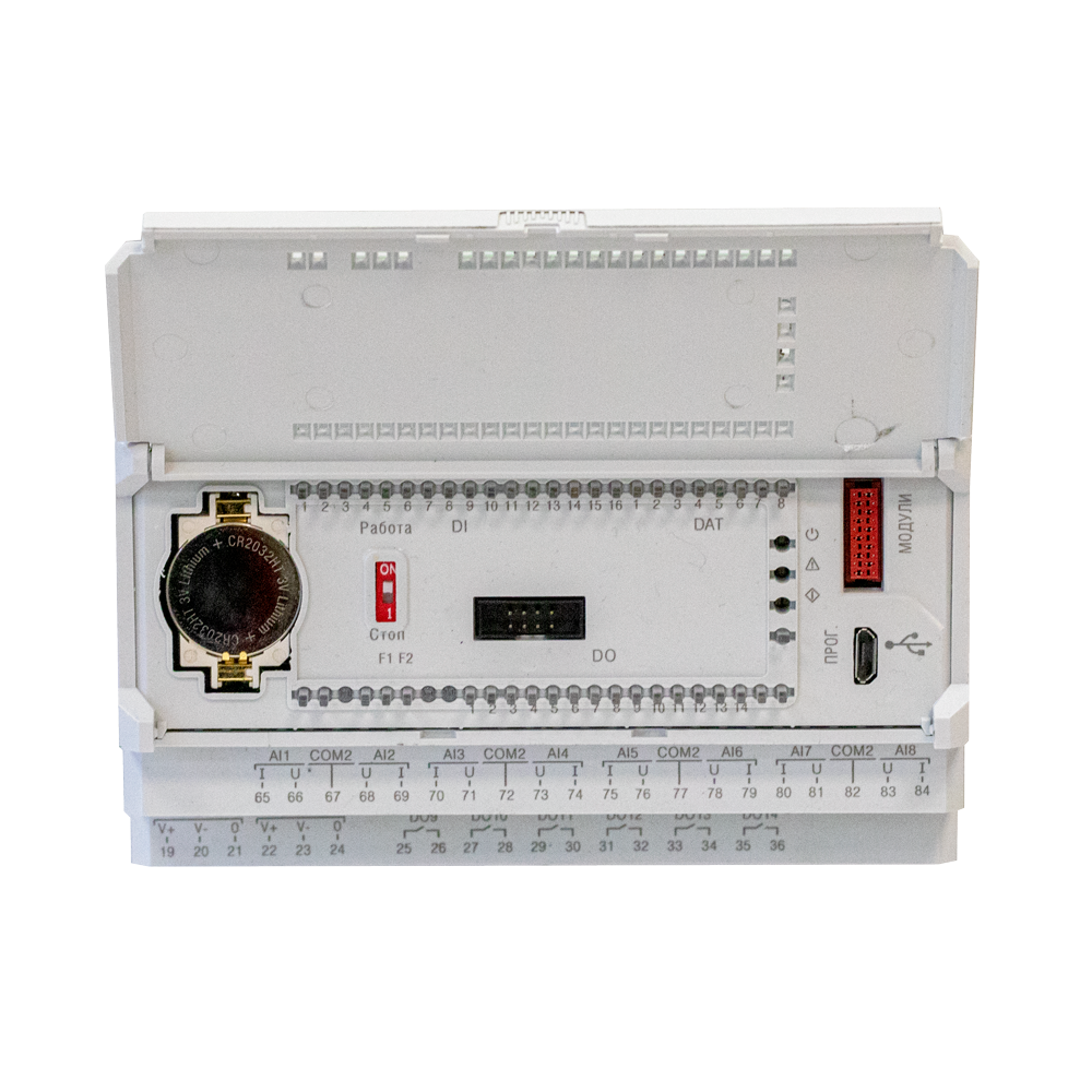 В корпусе 7DIN располагается 40 аналоговых и дискретных входов/выходов. Для расширения собственных входов/выходов предусмотрено подключение по внутренней шине модулей расширения ПРМ. В ПР102 может быть до 2-х интерфейсов RS-485 на борту: для управления устройствами по сети и передачи данных на верхний уровень. Написание алгоритма осуществляется пользователем на языке FBD с помощью бесплатной среды программирования OwenLogic. Загрузка алгоритма производится с помощью кабеля microUSB.