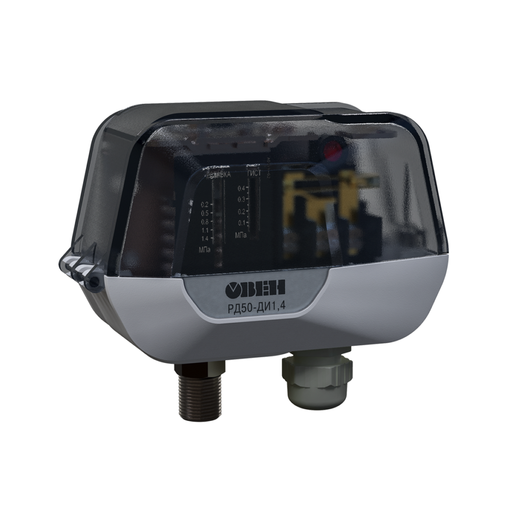 РД50 представляет собой механическое реле избыточного давления. Реле предназначено для управления аварийной сигнализацией путем переключения электрической цепи при падении давления в системе. Порог срабатывания реле и дифференциал настраивается пользователем.