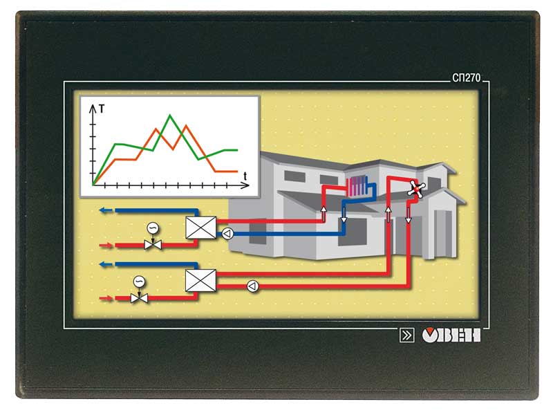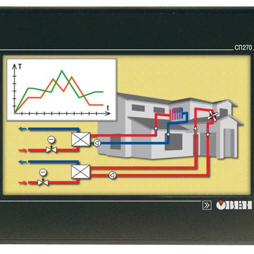 Цветная графическая панель с сенсорным экраном, поддерживает совместную работу с ОВЕН ПЛК, модулями ОВЕН МВА8, МВУ8, Мх110,а также с контроллерами и модулями других производителей.