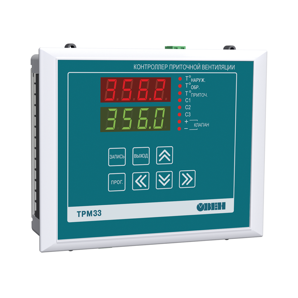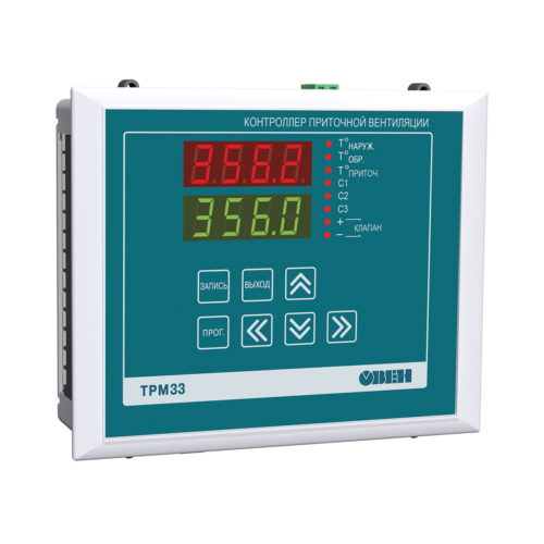 Прибор ОВЕН ТРМ33 предназначен для регулирования температуры воздуха в помещениях, оборудованных системой приточной вентиляции с водяным калорифером.