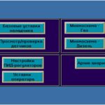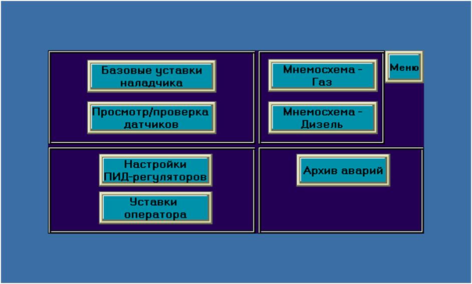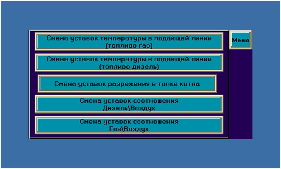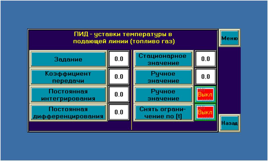 - Реализация режима «Работа» на двух видах топлива: газ и мазут в автоматическом и ручном режимах (регулирование соотношения газ/воздух, дизель/воздух). При этом на панели оператора должны отображаться значения параметров: