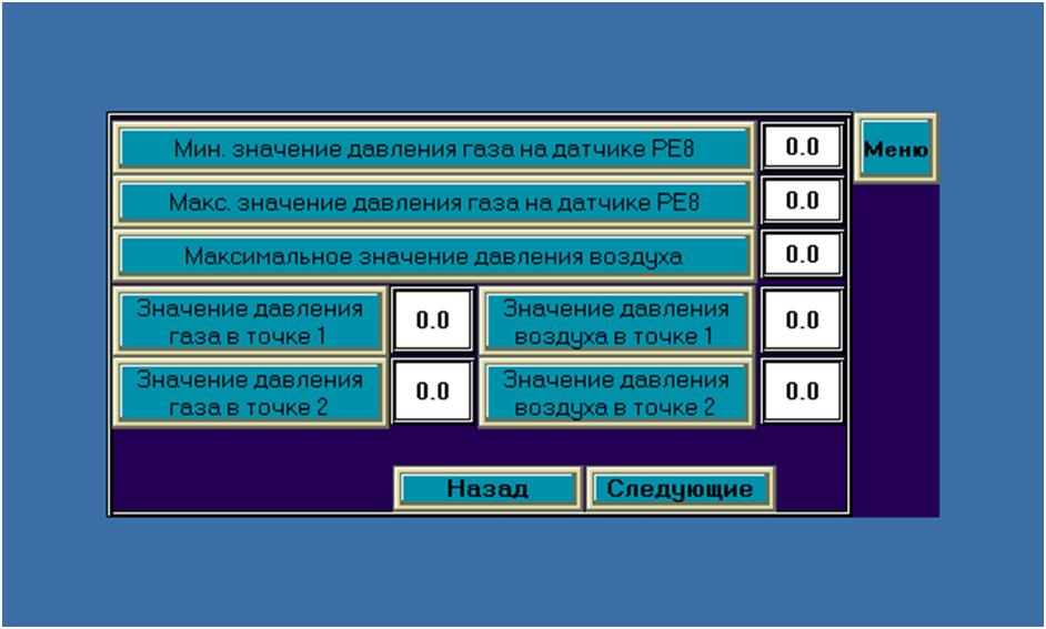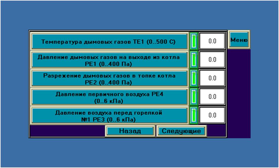 - разряжение в топке: диапазон регулирования 0 — (-400) Па, шаг 0,1 Па (возможность выхода через пароль в подменю для изменения параметров ПИД-регулирования); при выходе параметра регулирования за пределы нормы (стабильность параметра 3-5 с.) – отключение с блокировкой, световая и звуковая сигнализация.
