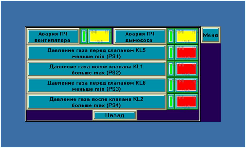 - Реализация алгоритма «Аварийное отключение котла» с выводом соответствующих аварийных сообщений: