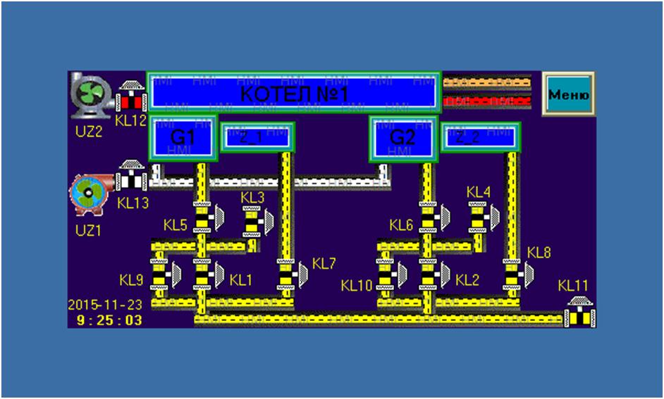 - Отображение на панели оператора технологической схемы котла КВГ-14-150 с состоянием (работа/авария или включено/выключено) основного оборудования автоматизации и выводом основных параметров системы – на главный экран панели оператора.