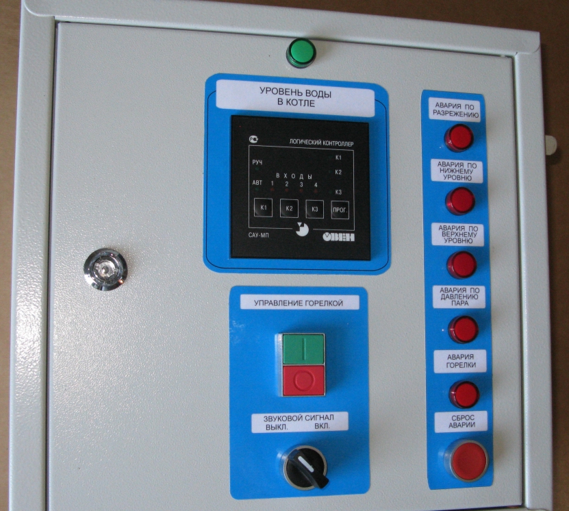Щит изготовлен для управления паровым котлом марки «КП-300Гн» парапроизводительностью 0,3 т/ч оборудованный двух ступенчатой горелкой марки RIELLO RS 5D.