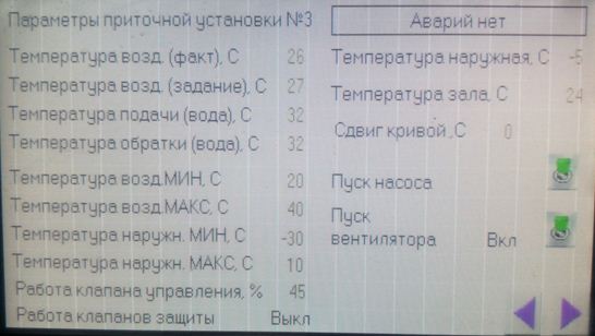 Шкаф управления ШУВ-1.1 входит в состав системы приточно-вытяжной вентиляции здания торгового центра и осуществляет управление процессом воздушного теплоснабжения, в котором задействованы три вентиляционных установки, расположенные на кровле здания. Для каждой установки предусмотрена работа по индивидуальному температурному графику. Интерфейс управления представлен удобной в эксплуатации сенсорной панелью ОВЕН СП270. Реализованная система безопасности предполагает контроль состояния защит по тепловому и электромагнитному действию тока силового оборудования, контроль минимально-допустимой температуры прямого и обратного теплоносителя радиаторов, отказы в работе контролирующих датчиков и пр. Информация о нештатных ситуациях немедленно отражается на панели управления, передается тревожным сигналом на общий пульт диспетчера. Так же реализовано SMS оповещение с использованием GSM-модема ОВЕН ПМ01. В SMS сообщении передается подробная информация об одной аварии или группе. Имеется возможность дистанционно сбросить текущие аварии, а также опросить систему при помощи SMS или телефонного звонка.