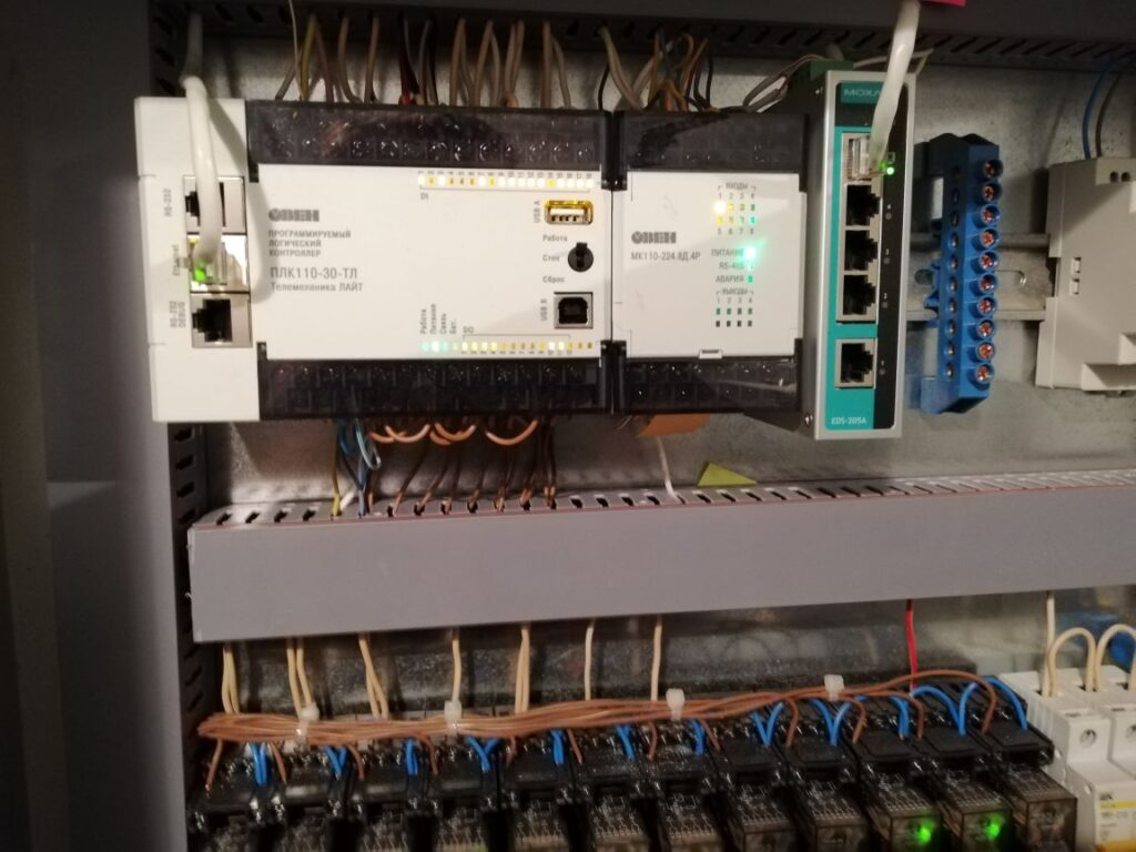 Управление и мониторинг основным и вспомогательным оборудованием объекта осуществляется посредством сбора сигналов контроллером ОВЕН ПЛК110-30-ТЛ и модулем ввода-вывода ОВЕН МК110-8Д-4Р. Измерение температуры производится при помощи датчика температуры и влажности ОВЕН ПВТ10.