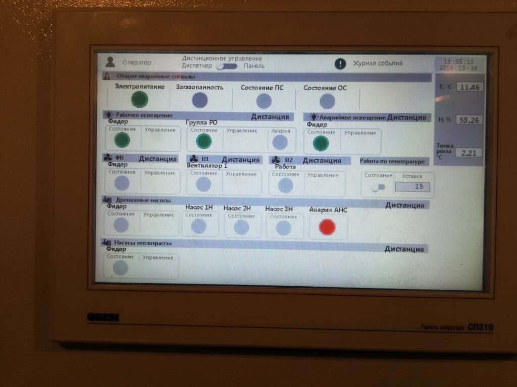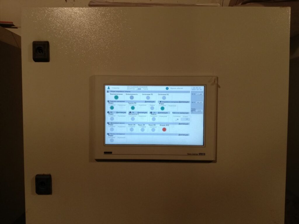 Мониторинг системы реализован на двух уровнях – местном (шкаф управления) и дистанционном (в диспетчерском пункте). Для отображения информации на местном уровне используется сенсорная панель оператора ОВЕН СП310. Система диспетчеризации реализована на базе SCADA-системы ОВЕН Телемеханика ЛАЙТ.