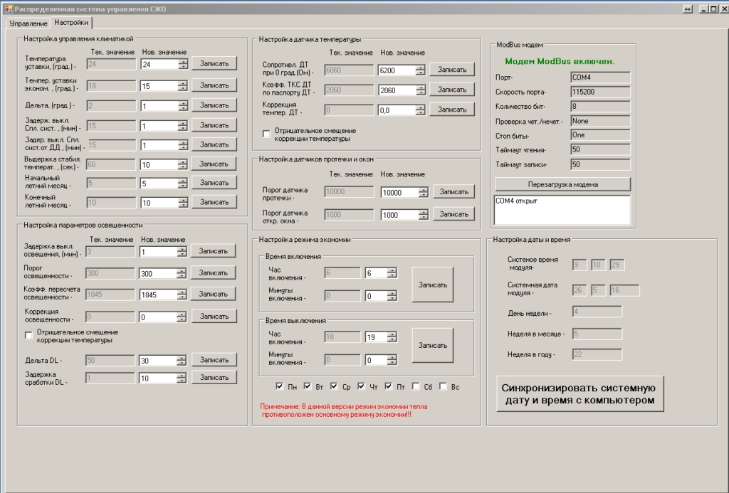 Объединение распределенных локальных устройств осуществляется по RS-485 (Modbus).