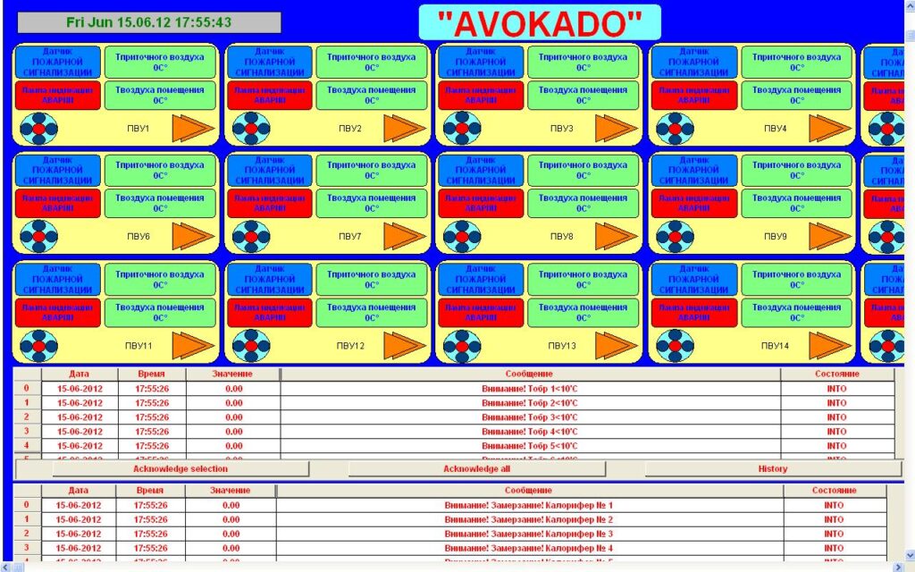 Контроллеры вентиляции объеденены в локальную сеть. Вся информация выводится на пульт оператара.