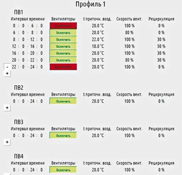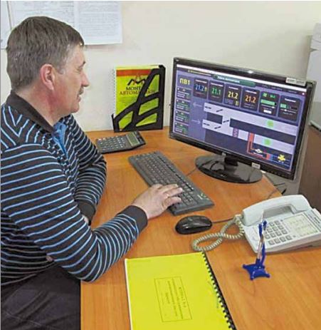 На дисплей контроллера может выводиться вся информация о работе системы. Дисплей поделен на несколько экранов, каждый из которых содержит информацию о текущих уставках и состоянии системы. Вся аварийная сигнализация также выведена на дисплей. Щит управления может работать в двух режимах – ручном и дистанционном из диспетчерского пункта. Щит управления подключен к сети через интерфейсную плату ПИ73. SCADA-система Разработанная инженерами оригинальная SCADA-система позволяет оператору отслеживать на графиках колебания температуры воздуха в помещениях, приточно-вытяжных каналах и на улице. С помощью SCADA-системы может отображаться любой процесс, каждая деталь или автомат в виде понятных человеку графических символов.
