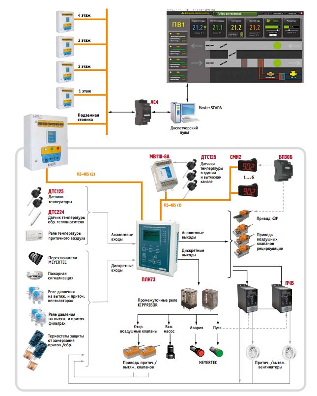 Управляющий комплекс для четырех этажей здания и автомобильной парковки включает пять щитов управления приточно-вытяжной вентиляции, подключенных к персональному компьютеру. Основу системы управления образуют приборы ОВЕН: